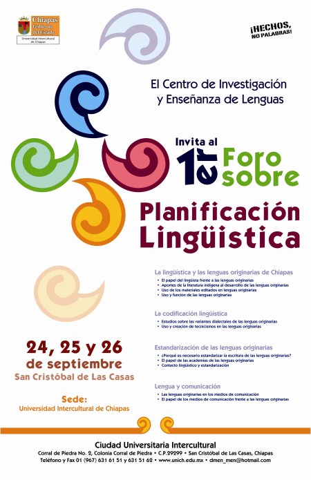 1. […] Foro sobre Planificación Lingüística (Chiapas, septiembre 08) Leí en el blog de Nila Vigil (en la foto) que el Centro de Investigación y Enseñanza de Lenguas de la Universidad Intercultural de Chiapas (México) organiza el 1er Foro sobre Planificación Lingüística. Será entre el 24 y 26 de septiembre en San Cristóbal de las Casas y cubrirá cuestiones como la estandarización de lenguas originarias, las variantes dialectales de las lenguas originarias, el uso de lenguas originarias, etc. Se pueden enviar resúmenes hasta fines de agosto. +info […]