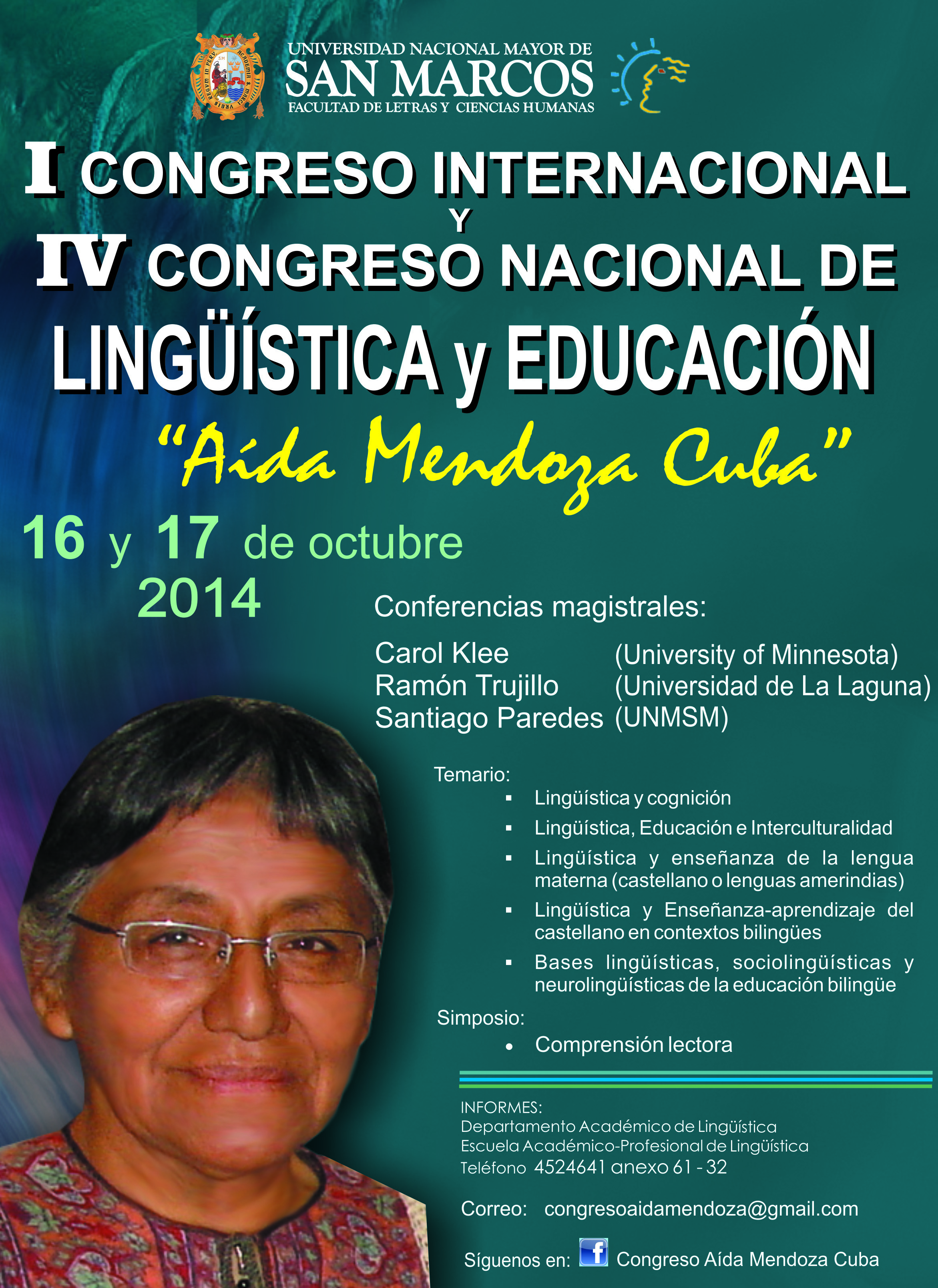 La Universidad Nacional Mayor de San Marcos (Auditorio de la Facultad de Letras y Ciencias Humanas), durante los días 16 y 17 del mes de octubre del presente año, llevará a cabo el I Congreso Internacional y IV Congreso Nacional de Lingüística y Educación «Aída Mendoza Cuba».